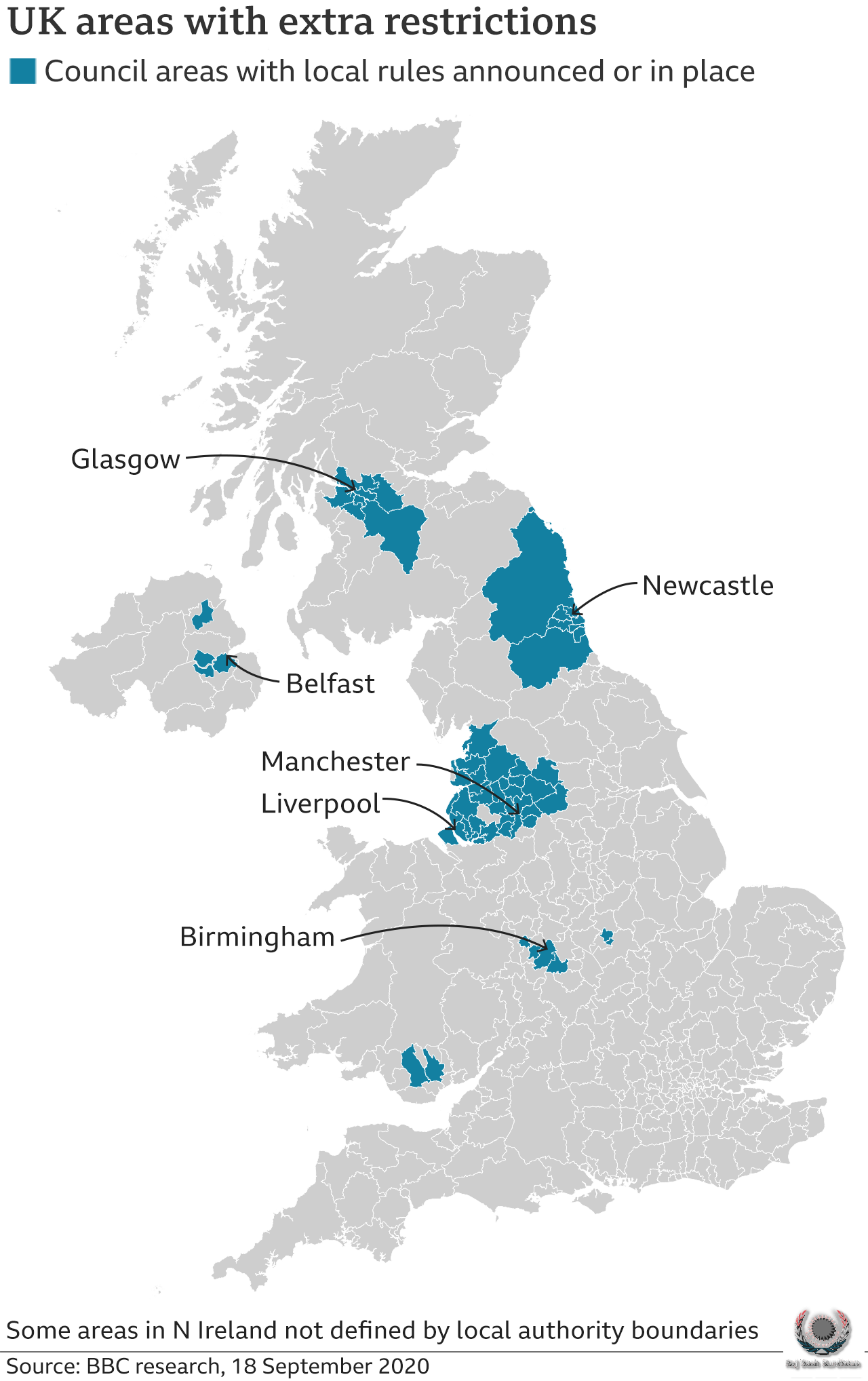 Under the restrictions, people will not be able to enter or leave the areas without a reasonable excuse. They will not be able to meet indoors with anyone they do not live with, with extended households suspended.